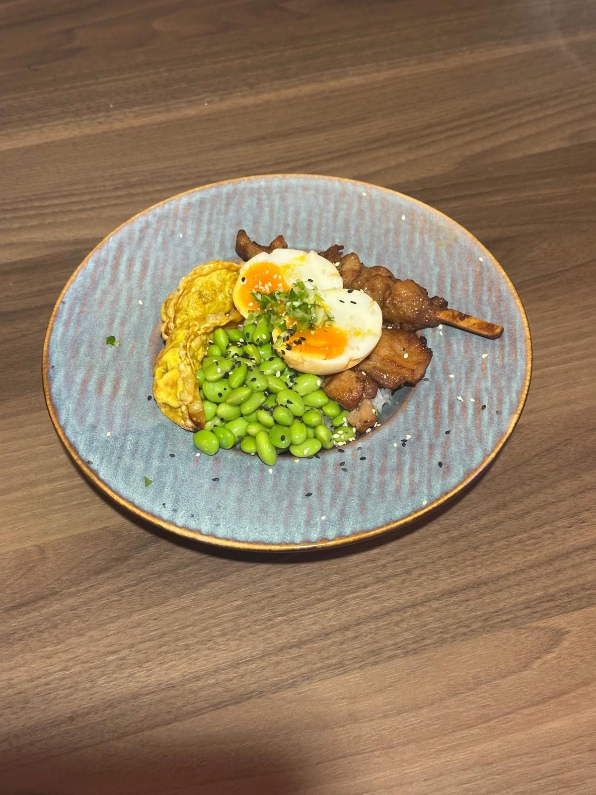Marinated jasmine rice with edamame, chicken & curry gyoza, yakitori skewers, and marinated egg.