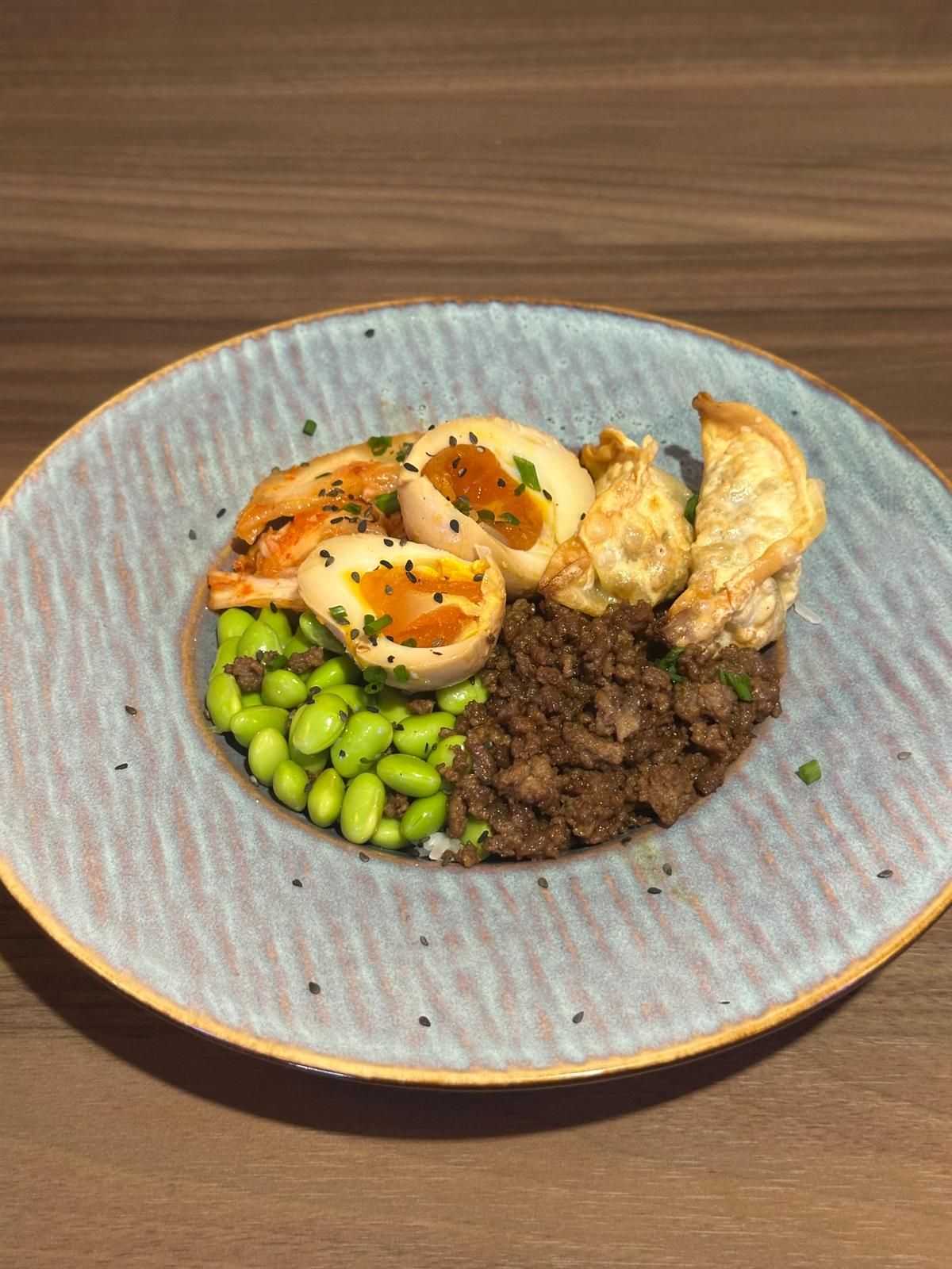 Marinated jasmine rice topped with edamame, beef gyoza, shredded beef, kimchi vegetables, and marinated egg.