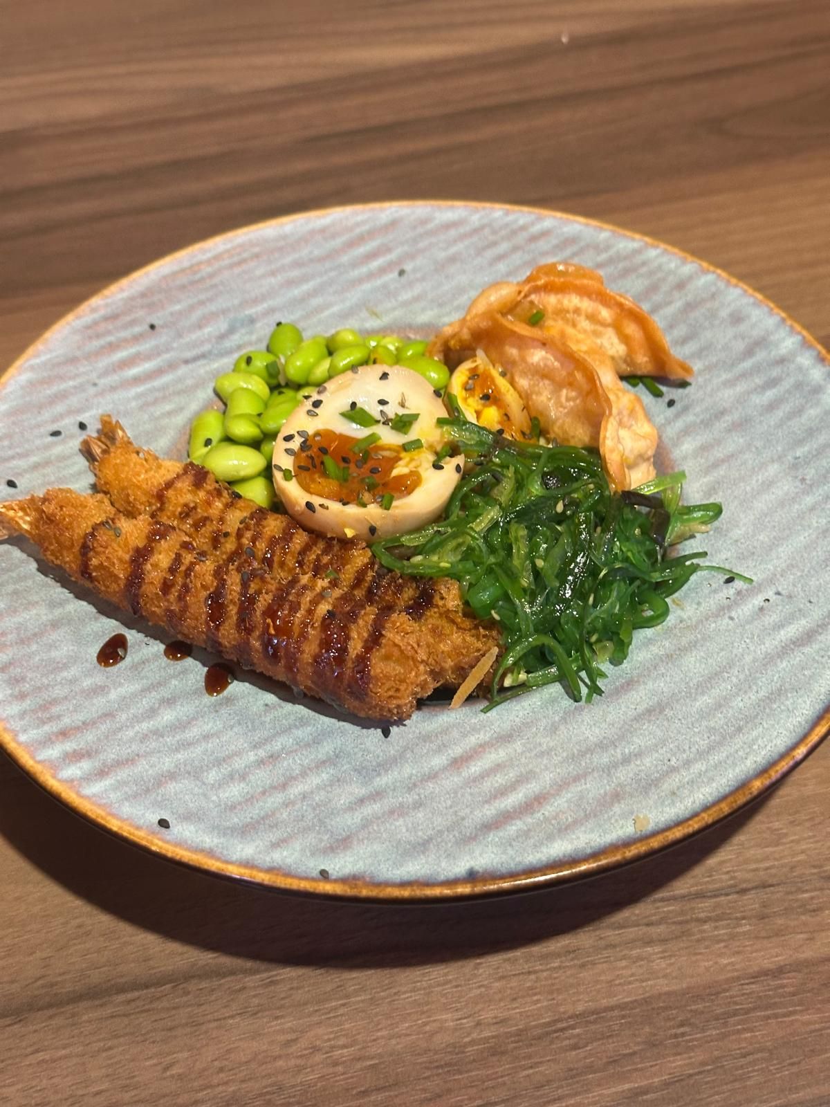 Marinated jasmine rice topped with edamame, goma wakame, shrimp gyoza, tempura shrimp, and marinated egg.